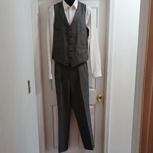 Elevate your style with this custom gray, three-piece suit, ideal for any formal occasion. A vintage must-have for any classic gentleman's wardrobe. Features a handsome light and dark gray plaid pattern with red and gold accent stripes. Includes a tailored notch lapel blazer with two-button front closure, two flap front pockets, four-button adorned sleeves and single-vented back; a five-button, lapel vest with satin back; and pleated trousers with cuffs, belt loops as well as buttons inside for suspenders. Note: There is one button missing along top of the trousers, as pictured. Otherwise, the suit is well preserved. A true timeless classic that was custom designed for its original owner.