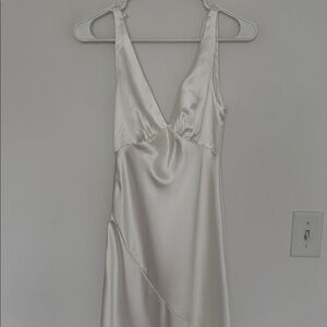 Stunning white satin gown with a deep V-neckline. Perfect for bridal occasions. Great condition, only worn once and no flaws. If measurements are needed, please comment below.