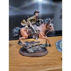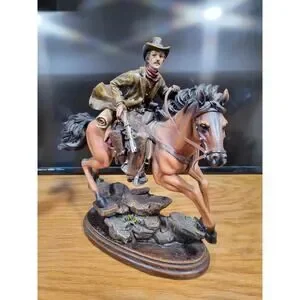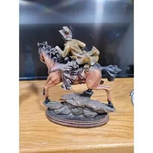 This Southwest-themed man on a horse figurine is a small, detailed piece made of resin, wood, and clay. Standing at approximately 14" x 9", this tabletop sculpture features a multicolor finish with a matte finish, perfect for any room in your home. The cowboy and western theme, along with Southwestern style, make it a unique and eye-catching addition to your decor. This original piece from the Southwest Theme collection captures the essence of the American West, making it a perfect collectible for horse enthusiasts and fans of the Southwest region.