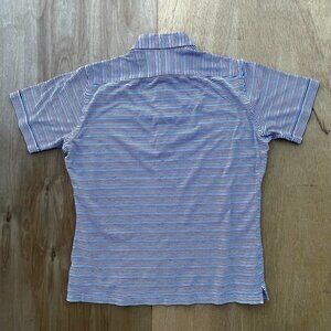 Excellent Condition SAKS FIFTH AVENUE STRIPED POLO SHIRT WOMEN’S sz S Blue Brown White Short Sleeve