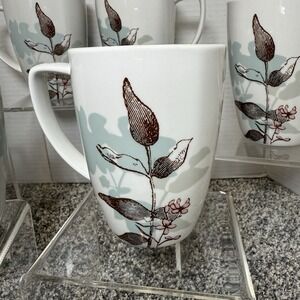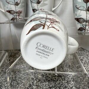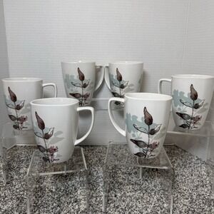 The product is a set of six Corelle Coordinates coffee/tea porcelain mugs in brown, light blue, white and a touch of pink colors. These mugs feature a Twilight Grove pattern with a rounded square shape, perfect for all occasions. Made of dishwasher-safe porcelain, each mug has a 12oz capacity and is machine washable for easy care. With a mid-century modern style and floral theme, these vintage mugs are a stylish addition to any coffee or tea collection. Made in China, these mugs are a glossy finish and bear the printed Corelle Coordinates backstamp.