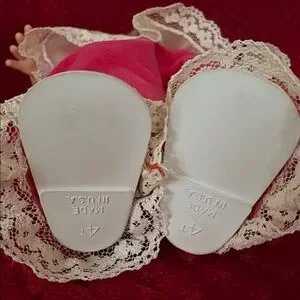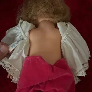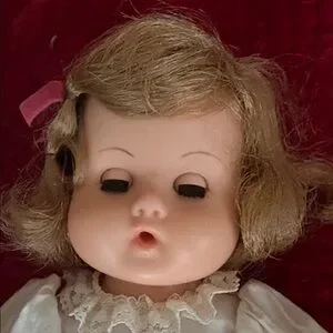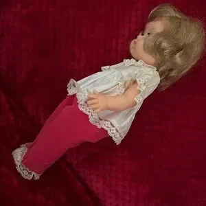 This is an adorable doll that my mom gave me to Cell who took really good care of her dolls. This is a vogue, Jennie baby doll that's approximately 12 inches tall. She is in good condition. Whenever she lays down her eyes close and whenever you lift her up her eyes open.Overall, she is in good condition. Shows minor wear and marks. The doll looks to be in phenomenal condition with where to her hair. Her clothing shows where but still looks nice. Her eyes are a stunning blue. This doll was designed to drink water and pee. However, my mom never put water in her. The elastic band around her waist has stretched out from age. The lace on the bottom part of her pants has ripped.