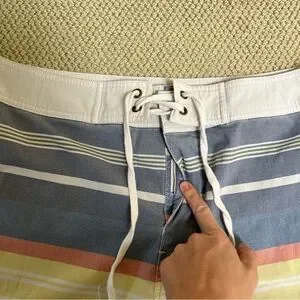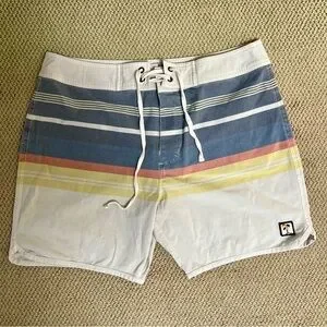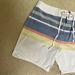 Details: Marine Layer Board Shorts. Waist tie with velcro closure. Cream with light colored stripes. Very stretchy. Great for swimming, surfing, beach days and pools days. Quick dry material.