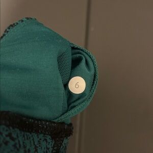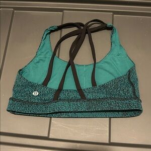 Stylish sports bra with a teal and black pattern. Features a strappy back design. Ideal for workouts.