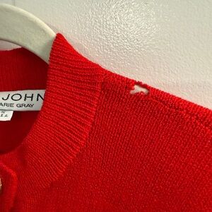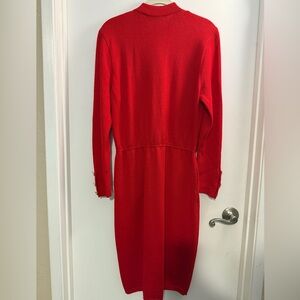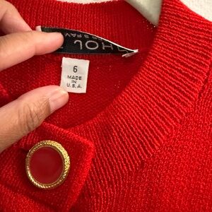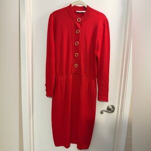 Vintage knit dress by St. John. Features a stylish gold button detail. Real pockets. Please note the two following minor flaws: small hole on shoulder (looks like shoulder pads were removed) and small in one of the pockets. Please refer to photos for locations. Hole on shoulder is not visible from the front. Other than that, it’s in excellent condition!
