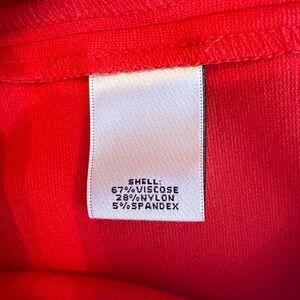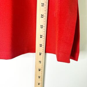 Really striking bright red tunic top from Neiman Marcus in a fabric that feels like double knit and has a scuba like vibe. Tailored to be form fitting, elbow length sleeves, longer tunic length for a slimming look. Great holiday look. New without tags, in like new condition showing no signs of wear or defects. Size 10.