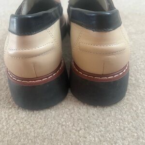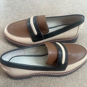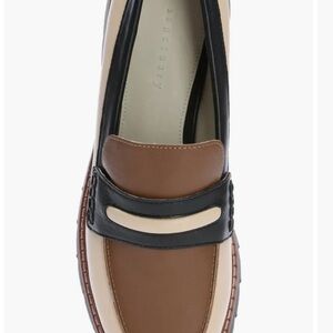 Step out in style with these chic two-tone loafers. Featuring a blend of cream and brown with black accents, these shoes offer both comfort and elegance. Perfect for any occasion. A soft leather upper and layered vamp strap lend luxe elements to a sophisticated loafer set on a cushioned footbed and treaded rubber sole.