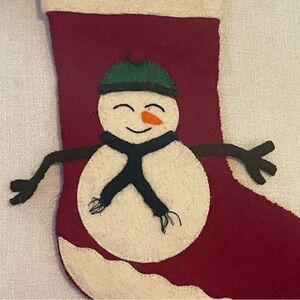 Experience the charm of the holidays with the Hand Felted Wool Christmas Stocking - Snowman. This beautiful stocking showcases a cute snowman design, adorned with a hat, scarf, and branch arms.