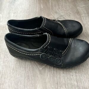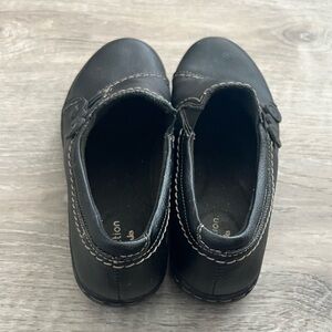 Clarks womens slip on loafers in black size 6.5, great condition but could use a tiny smudge of leather cleaner to take care of the spots