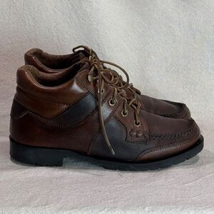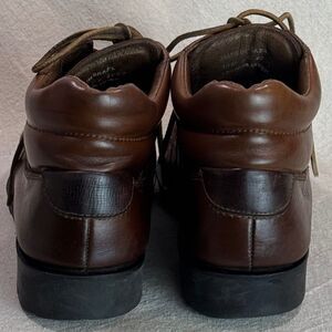 Previously worn; made in Brazil; leather uppers--made of smooth and textured leather with water repelling finish; 5 eyelets with leather laces; leather lined; full removable insoles; "vibrate" pattern rubber soles and heels. Boots are in very good condition. #bass #bootandshoetraders