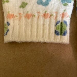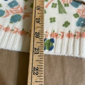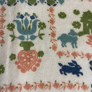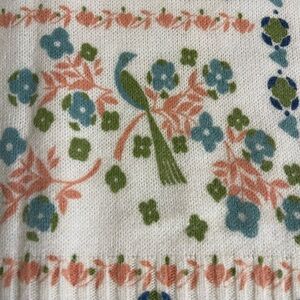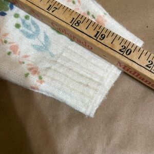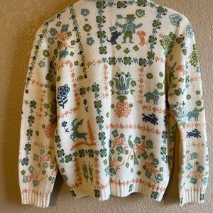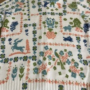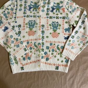 This cardigan is in pristine condition. The only thing missing is the size. This is a beautiful piece with a whimsical pattern. The colors are soft and feminine with gorgeous pearl like buttons.