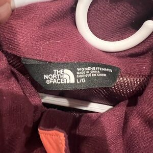 Vibrant coral with purple interior outerwear by The North Face. Ideal for outdoor activities. Small stain on back left shoulder that is pictured.