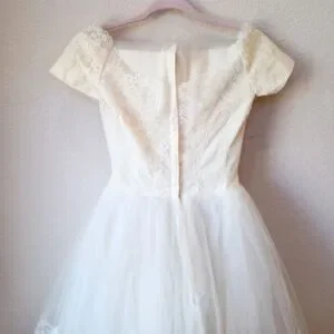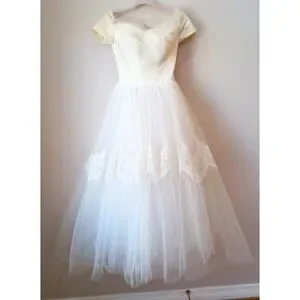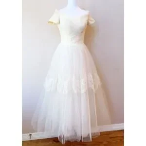 Rike's vintage 1950s stunning tulle off the shoulder tea length wedding gown