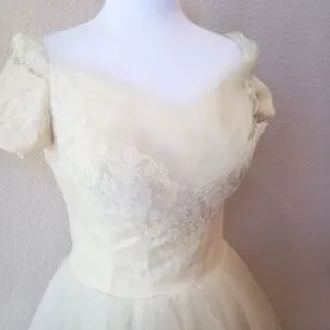 Rike's vintage 1950s stunning tulle off the shoulder tea length wedding gown with lace details. Excellent condition for a gown from the 1950s. There is some minor yellowing as shown in photos. Honestly the photos don't do justice to how beautiful this gown is.