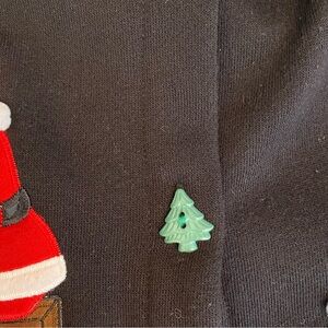Karen Scott Cotton Rich Vintage Black Christmas Cardigan Sweater. Super soft black cotton cardigan with green Christmas tree shaped buttons down front. Santa and elves motif on bottom front of sweater. Such a unique and whimsical holiday wear item for your closet! Shoulder pads tack stitched in shoulders, interior is brushed plush cotton. Excellent, like new condition.