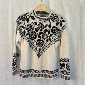 Beautiful vintage Forenza sweater featuring a bold black rose knit pattern on a cream base. Ramie/cotton blend gives it that classic 90s textured feel. Unique details include the side shoulder button closure and patterned hem + sleeves. Perfect for fall/winter vintage lovers, cottagecore styling, and classic 90s fits.