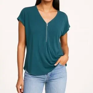 Elevate your style with this chic teal V-neck top featuring a stylish zip detail. Perfect for any occasion.