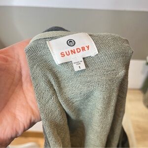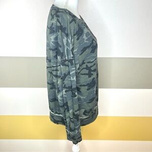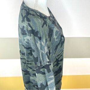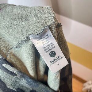 I have here this amazingly comfortable green camo camouflage viscose cotton blend grunge athleisure lounge casual easy going punk bohemian ragen loose scoop neck long sleeve pull over sweatshirt. This sweater is by Sundry from Anthropologie and is a size 1 ( small ).