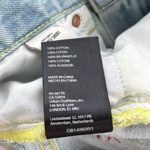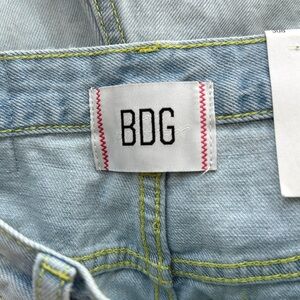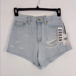 BDG Pitched Waist denim/jean shorts. Size 26. New with tags. Light wash. Distressed. Cut off hems. High Rise. Waist measures 26 inches. Rise 11.5 inches. Inseam 3 inches. Comes from a smoke free home.
