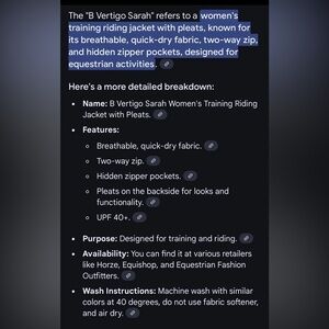 This is a fantastic stylish jacket from B vertigo. Classic styling mixed with modern materials. Just like your favorite yoga jacket except for riding!