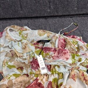 Elegant floral blouse with ruffle accents. Features pink, green, and cream hues. Perfect for a stylish ensemble.