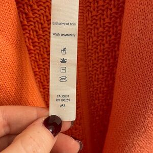Bright orange cardigan with textured knit. Features open front and pockets. Ideal for layering. Gently used