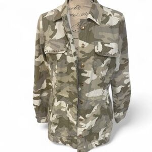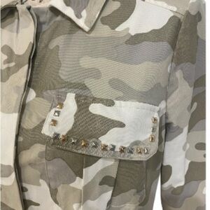⭐ Chic meets edgy! Boston Proper metallic camo utility jacket, size Small. Features studded chest pockets, hidden button placket, and interior drawcord for a flattering fit. A bold layering piece that takes any casual look up a notch! ⭐