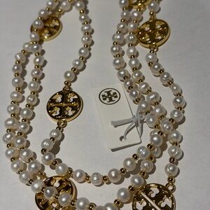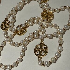 Tory Burch single strand Evie small beads pearl logo long necklace