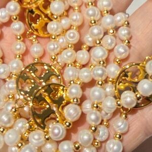 Elegant single -strand long necklace. Features small beads Evie pearls and gold medallions charms logo and small gold beads between pearls . Perfect for any occasion.