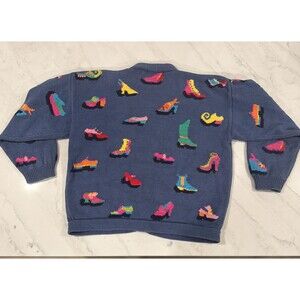 Vintage Christine Foley blue cotton cardigan with multi-colored shoe pattern