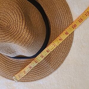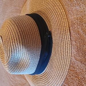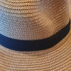 Chic straw sun hat featuring a black band. Perfect for sunny days.