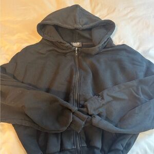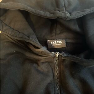 Stylish black hoodie with off-shoulder style. Features a front zipper and relaxed fit. Perfect for casual wear. Like New. Only worn a couple times. XXS/ XS