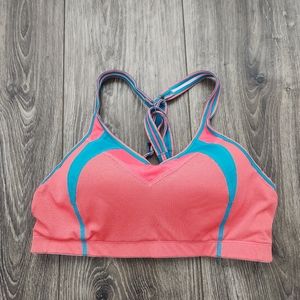 Stylish sports bra with supportive design. Features vibrant pink and blue colors. Ideal for active wear.
