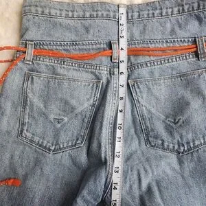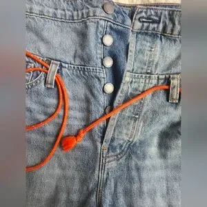 Elevate your wardrobe with these stylish blue jeans featuring unique orange accents. Perfect for a casual day out or a trendy evening look.