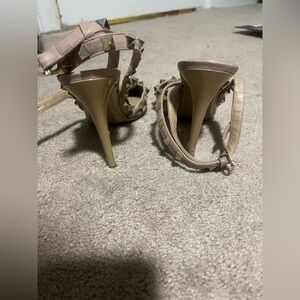 Authentic Valentino Garavani Rockstud Slingback Heels in the classic Nude Patent with Blush leather straps and signature gold-tone pyramid studs. A timeless, iconic designer heel.