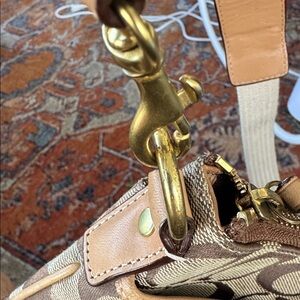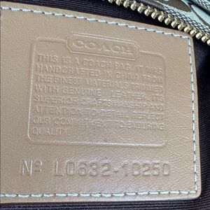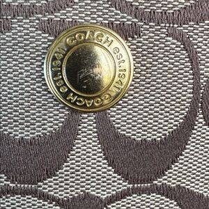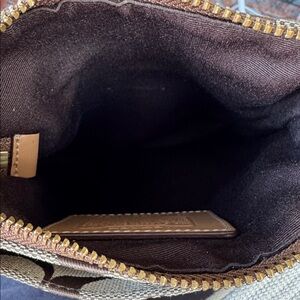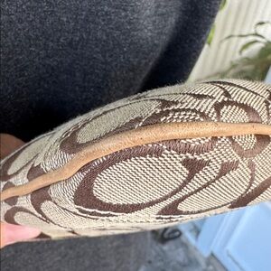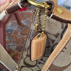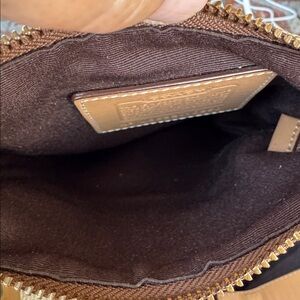 This authentic Coach purse is made of signature C canvas and features: zip closure, leather trim, gold tone hardware. Adjustable woven strap for comfort and front and back exterior slip pockets. Approximately 6 1/2” x 8 1/2”. New Condition