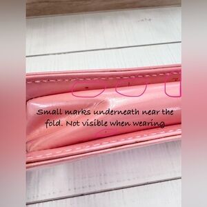 The marks on the sides and under the bottom are near the folds and not visible when wearing the bag. I had to pull the sides apart to see them.