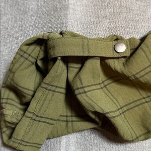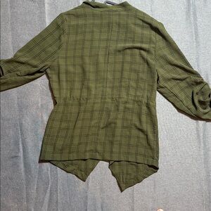 Chic Soho top with button strap to role up sleeves in dark green. Features a stylish plaid pattern. Ideal for versatile wear.