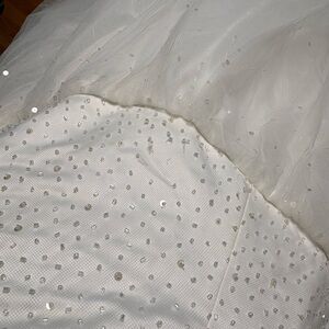 This strapless ivory ball gown features a sparkling beaded bodice and a full layered tulle skirt that floats beautifully with every step. Soft sweetheart-style neckline (straight across with sheer mesh at the top) and a structured waist for a flattering silhouette.