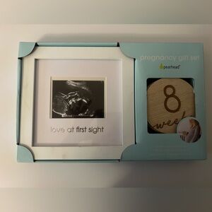 Celebrate the journey of motherhood with Pearhead’s Pregnancy Gift Set, featuring a charming sonogram picture frame and a set of beautifully crafted wooden pregnancy milestone discs. The white sonogram frame, adorned with the heartfelt words "love at first sight” in silver lettering, let’s you showcase your precious 4x3 ultrasound photo. The frame comes complete with an attached tabletop easel and a triangle wall hanger, allowing for versatile display options. This kit also includes our delightful 4x4 wooden milestone discs, a set of 8 double-sided photo props to easily document your pregnancy journey from 8 weeks to 40 weeks. Capture each month’s growing baby bump with these classic neutral discs, accompanied by special markers like it's a Boy, it’s a Girl, Baby Coming Soon, and the sweet declaration, Hello World. Pearhead’s Pregnancy Gift Set is a great way to cherish and remember the anticipation, joy, and love that accompany the miraculous journey of expecting a little one. An ideal gift for any expecting mom, this set transforms each milestone into a tangible and beautiful memory to be treasured for a lifetime.