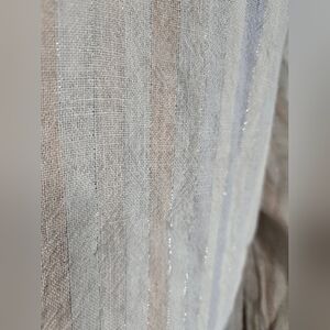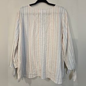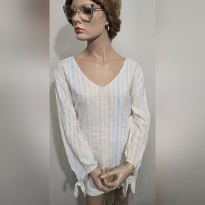 Chic V-neck blouse with pastel stripes and silver metallic threading. Cute ties at the bottom of both sleeves. Soft fabric and long sleeves. Perfect for casual wear. The pictures don't do this gorgeous blouse any justice.