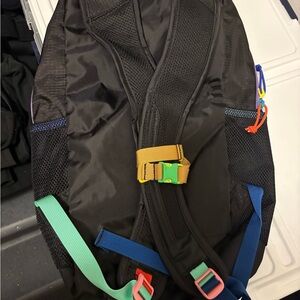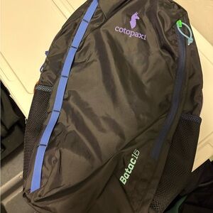 Sleek Cotopaxi backpack in black and blue. Features durable design and vibrant accents. Ideal for daily adventures.