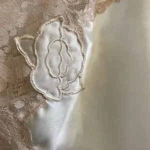 The cream colored camisole has beautiful lace and flower appliqués across the front