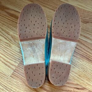 Charlotte Stone Martino Clog in turquoise suede. Beautiful low heel wooden clogs with a leather footbed and suede upper. 1" platform height + 2.5" heel height. Size 7. Excellent condition with some minor scuffs. Only worn once.
