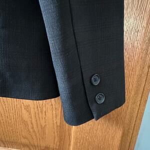 Daisy Fuentes Suit Jacket Size Large. Subtle plaid print on the black jacket. Rayon/Spandex blend. Chest measures 19 1/2 while buttoned. Sleeve length is 19 1/2” and overall length is 25 1/2”