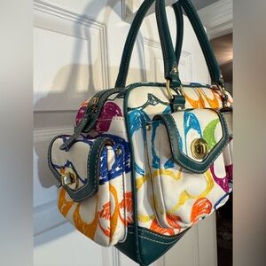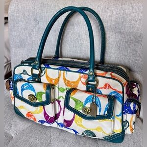 This is an authentic Y2K Coach satchel crafted from white scribble canvas fabric with vibrant embroidered multi-colored C’s, teal leather double handles & trim and brassy gold hardware.