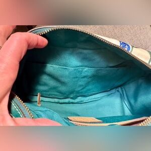 Interior is a matching teal fabric, and has two slip pockets and one zip pocket.