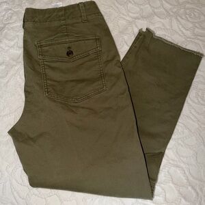Banana Republic Factory Authentic Chino Petite Ankle Girlfriend Fit Pants. Two Rear Patch Pockets with Two Front Cargo Style Pockets. Olive / Army Green. Pinched Knee Accent. Raw edge bottom.