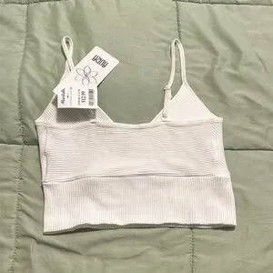 Stylish white ribbed crop top. Features a wrap design. Adjustable straps for comfort. Perfect for casual wear.