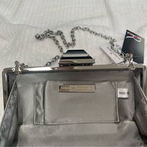 NWT Sondra Roberts Gray Silver Satin Twist Evening Clutch Silver Tone Chain Trim